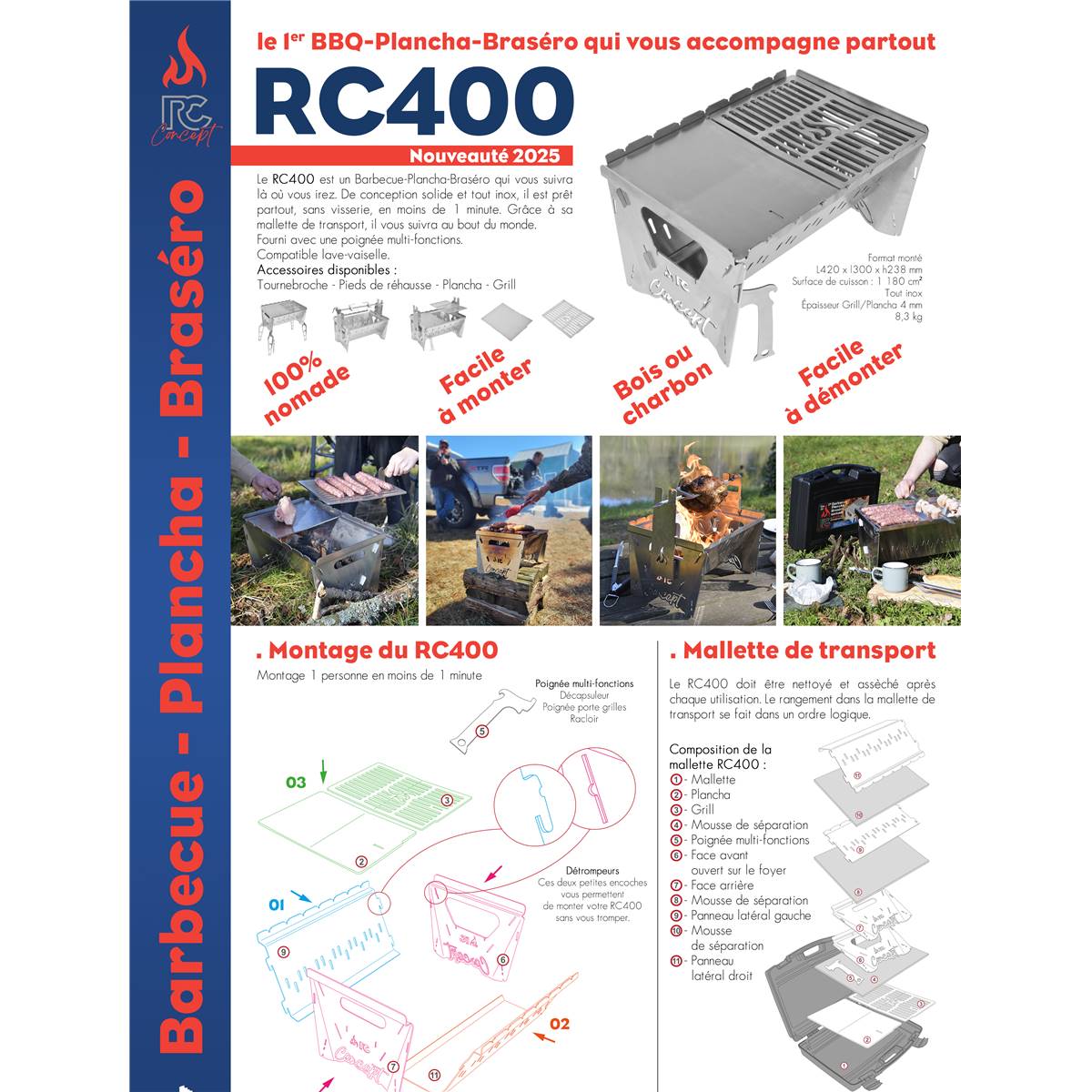 Le Barbecue Plancha Brasero Portable RC 400 vous suivra partout où vous irez. De conception solide tout en acier inoxydable qualitatif et robuste (épaisseur 4mm), il est prêt à l'utilisation partout, sans visserie, en moins d'1 minute d'assemblage. Grâce à sa mallette de transport rigide, il vous suivra ou bon vous semblera.