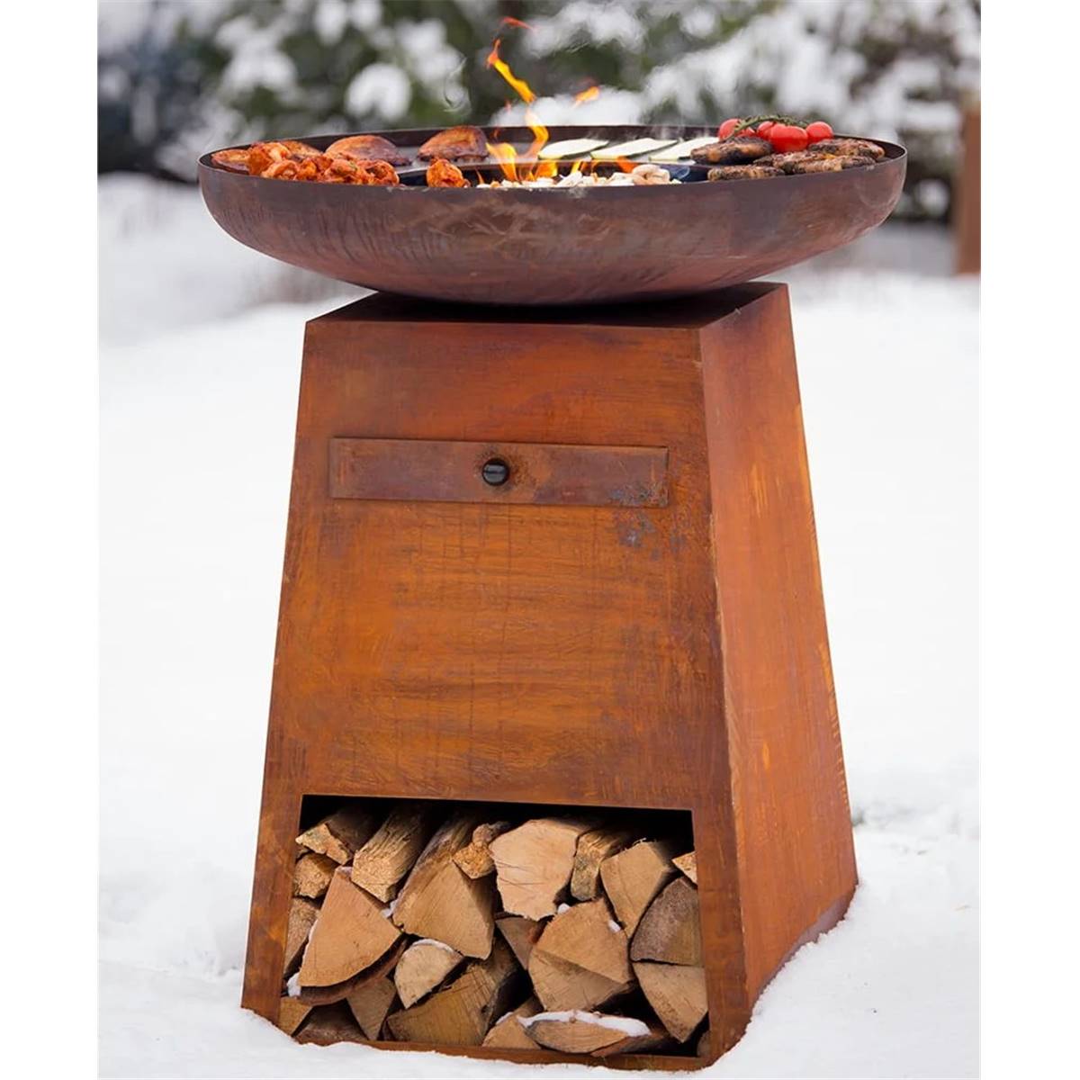 La base robuste offre également un espace de rangement pour le bois. Vous pouvez y stocker suffisamment de bûches pour toute une soirée. La plaque de cuisson en acier carbone de 6 mm d'épaisseur est certifiée pour le contact alimentaire.