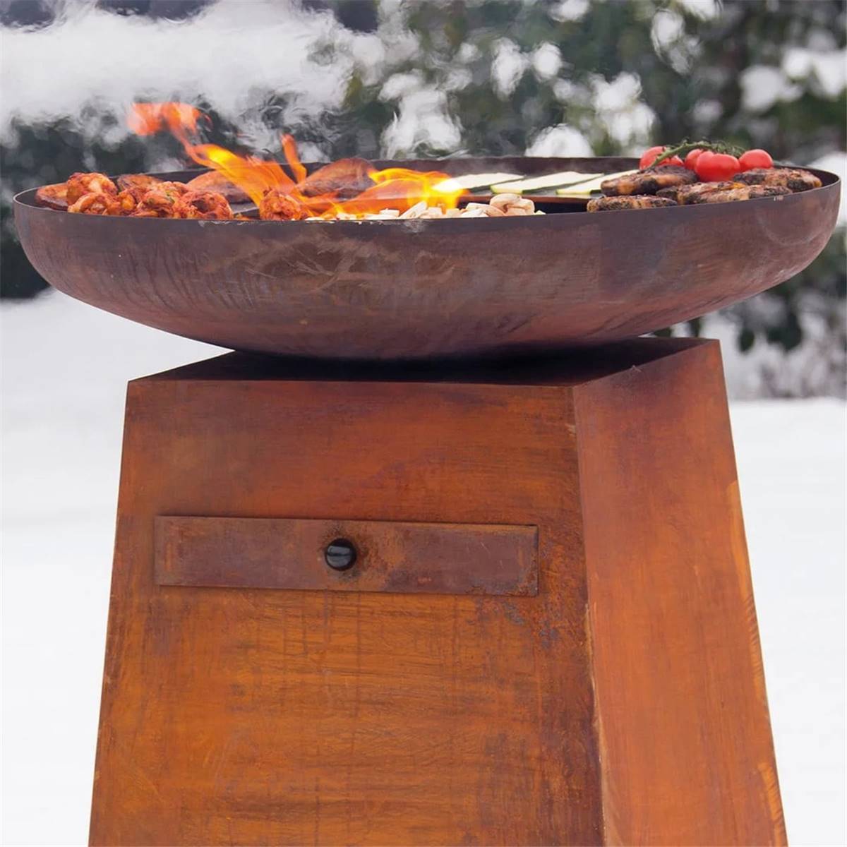 Avec le brasero / plancha ORION au design épuré de RedFire, vous disposez d'un équipement multifonctionnel pour votre jardin ou votre terrasse. Ce modèle de brasero, dont le design est breveté et protégé, est disponible en deux versions : la version noir mat ou la version en acier Corten avec aspect rouillée ici présentée. Le support de base robuste en acier Corten de 2 mm d'épaisseur, combiné au foyer et à la plaque de cuisson, lui donne indubitablement un look industriel et authentique, faisant de du brasero ORION un produit intemporel qui s'intègre dans n'importe quel environnement, du jardin en passant par la terrasse d'un restaurant, et peut même servir d'élément de décoration atypique lorsqu'il n'est pas utilisé.
